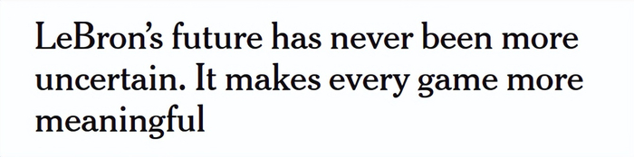 如今看他打球则截然不同,却同样激动人心。詹姆斯身边的消息源透露,他在全明星周日对记者说的那句“我不知道自己的未来会怎样”是认真的。队友和教练都在猜测他下一步会做什么,但没有任何人有确切答案。